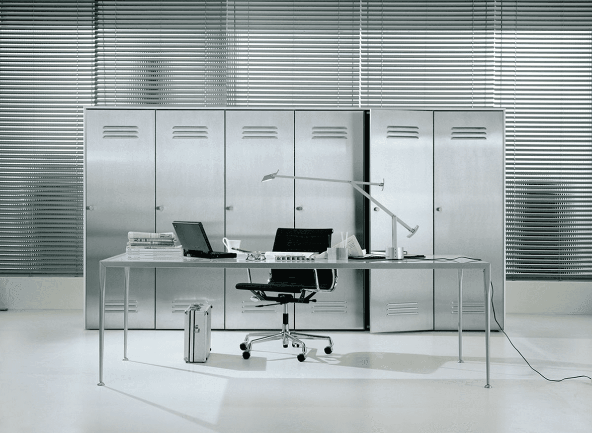 finishes and metal accents recede to foreground the garments—evoking the cool, precise language of the office and balancing elegance with attitude in a composed retail setting.
