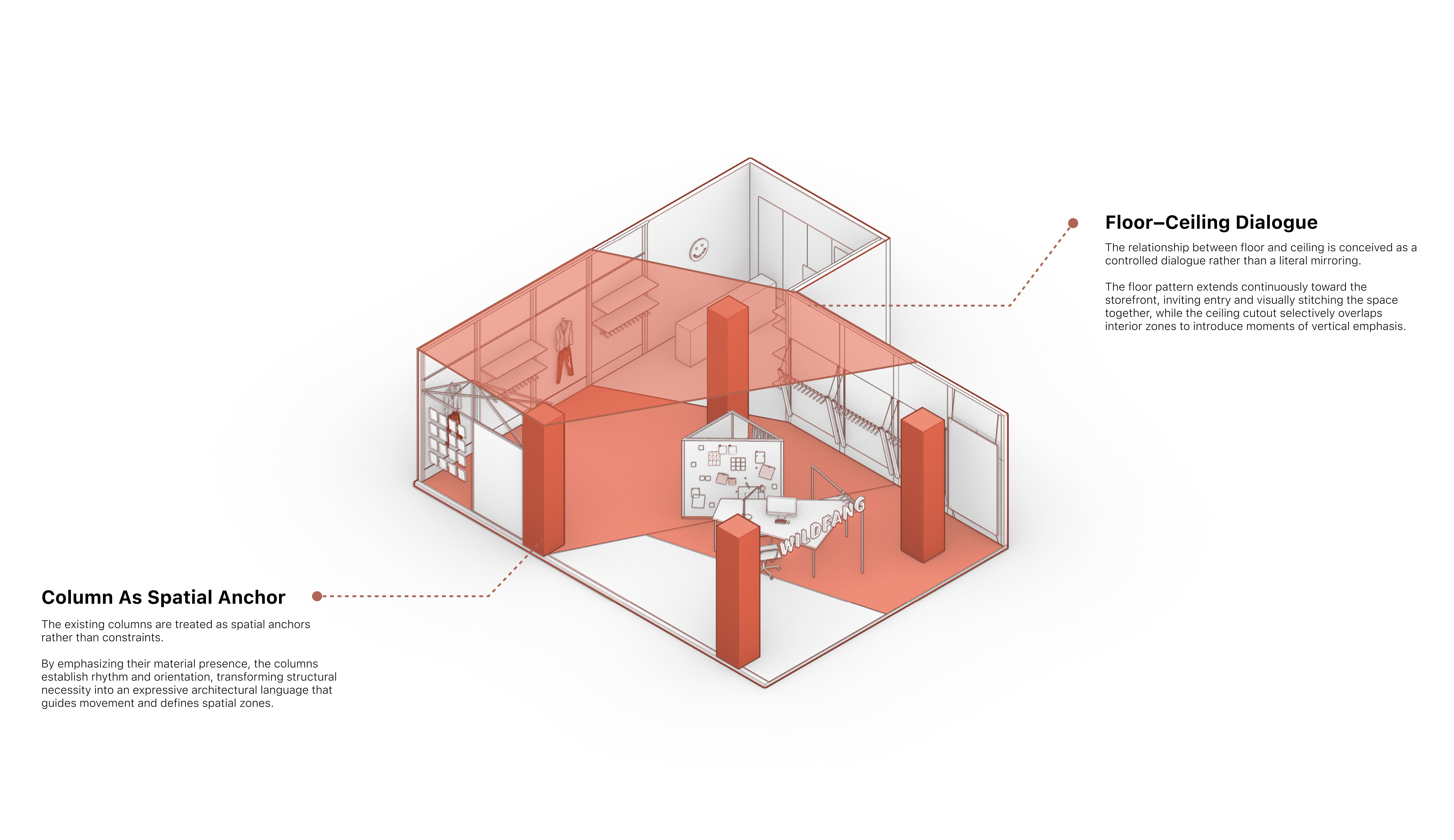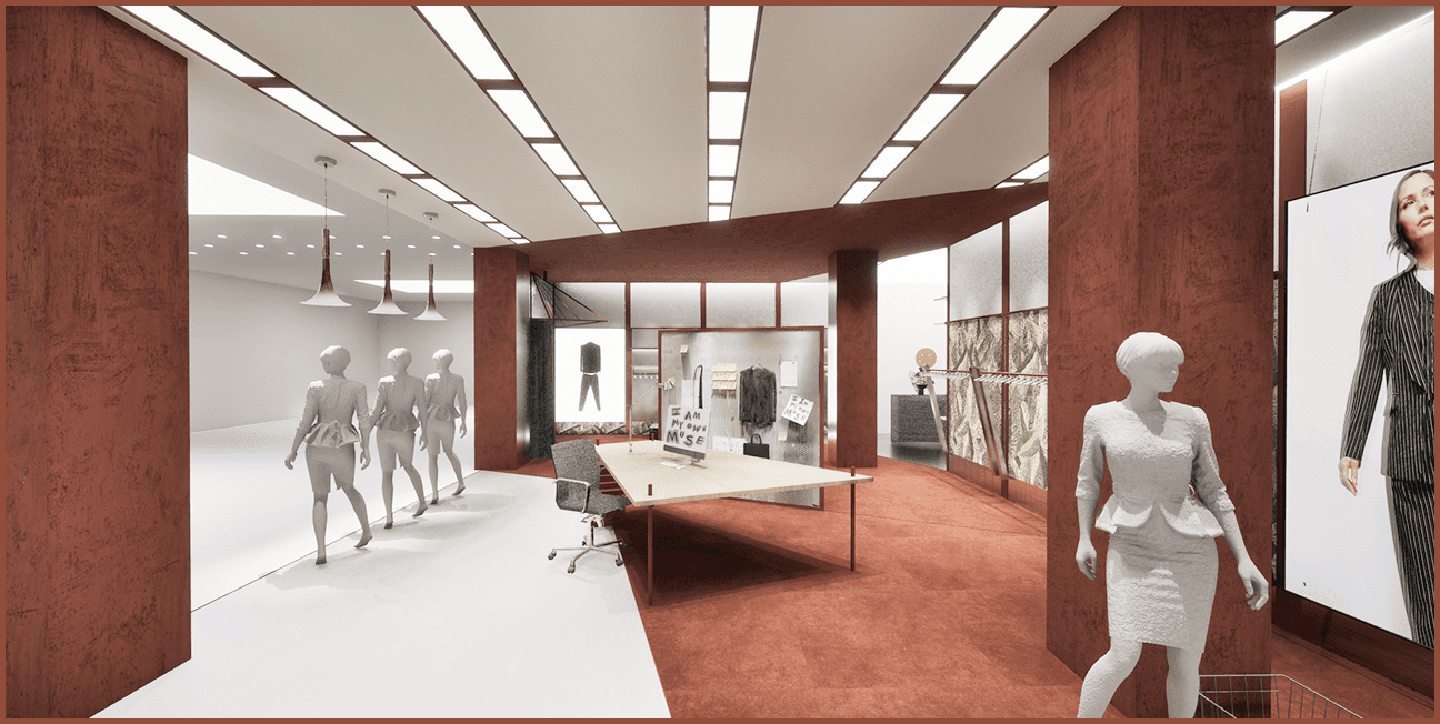 The design transforms structural elements and fixtures into an integrated spatial system, where columns anchor circulation, floor and ceiling engage in a controlled visual dialogue, and deconstructive fixtures choreograph fitting, messaging, and reflection. Together, these strategies create a layered retail environment that guides movement, frames the body, and allows brand identity to be experienced through spatial continuity, gesture, and gradual revelation.