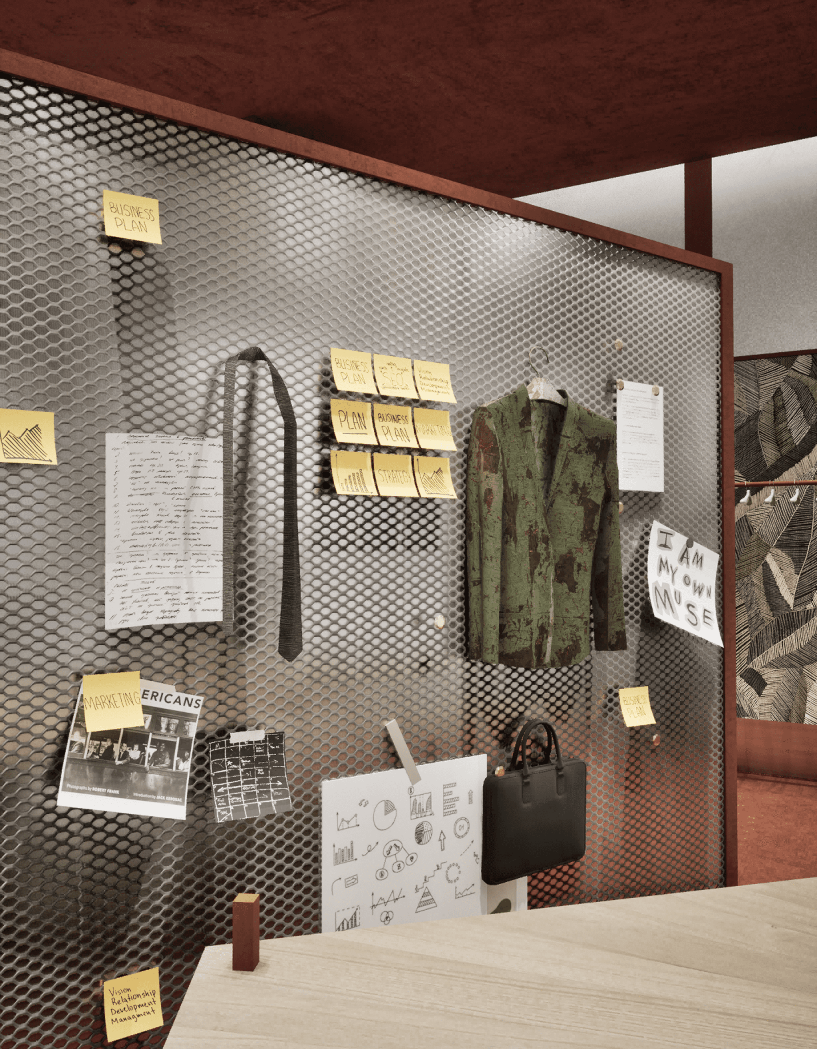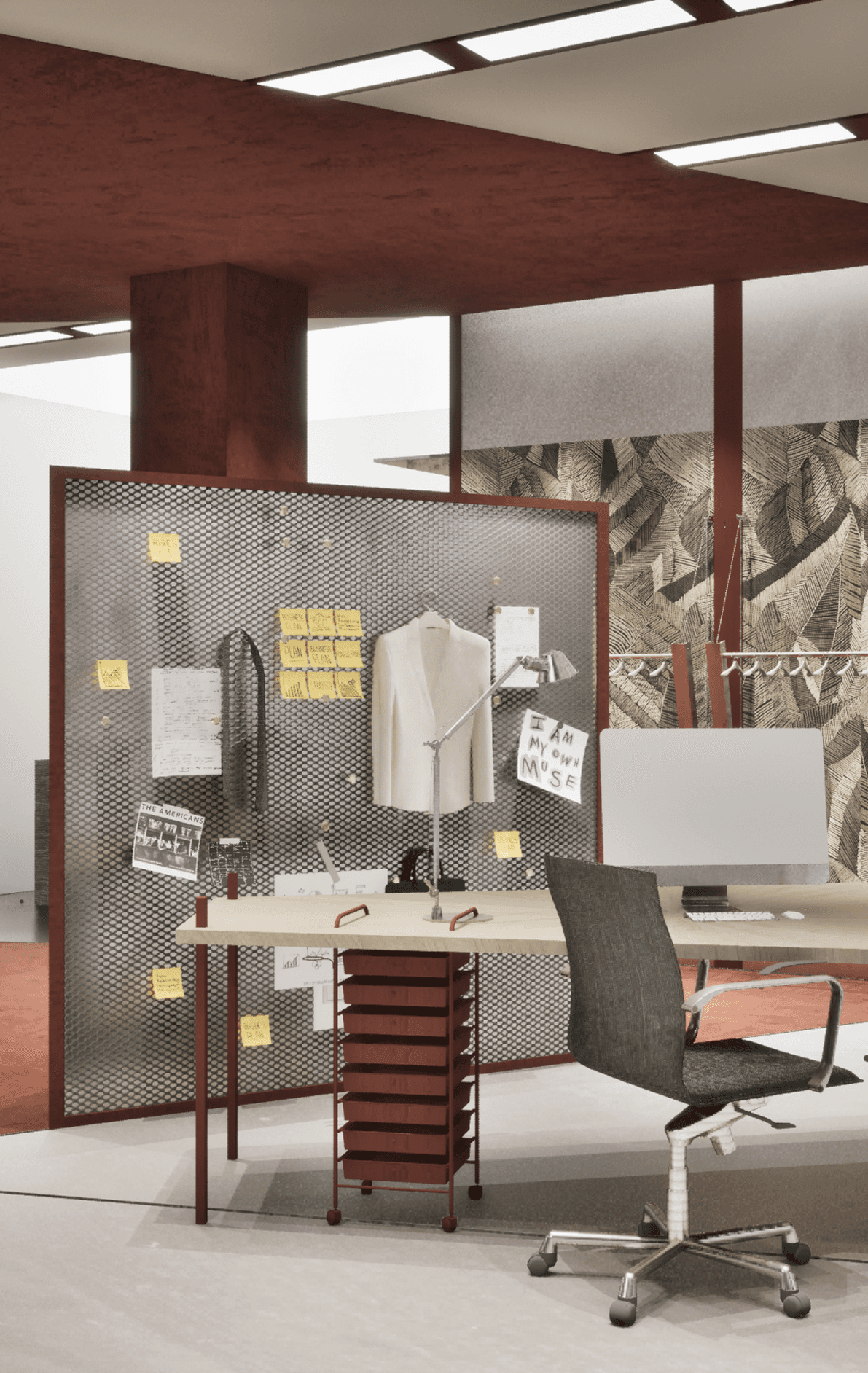 The spatial narrative unfolds like a staged office drama: a desk becomes a display plinth, filing cabinets morph into product shelving, and scaffolding doubles as both prop and structure. Movement through the store follows an “identity arc”—from entering as an observer, to trying on roles, to exiting as a participant in Wildfang’s queer workplace theatre.
