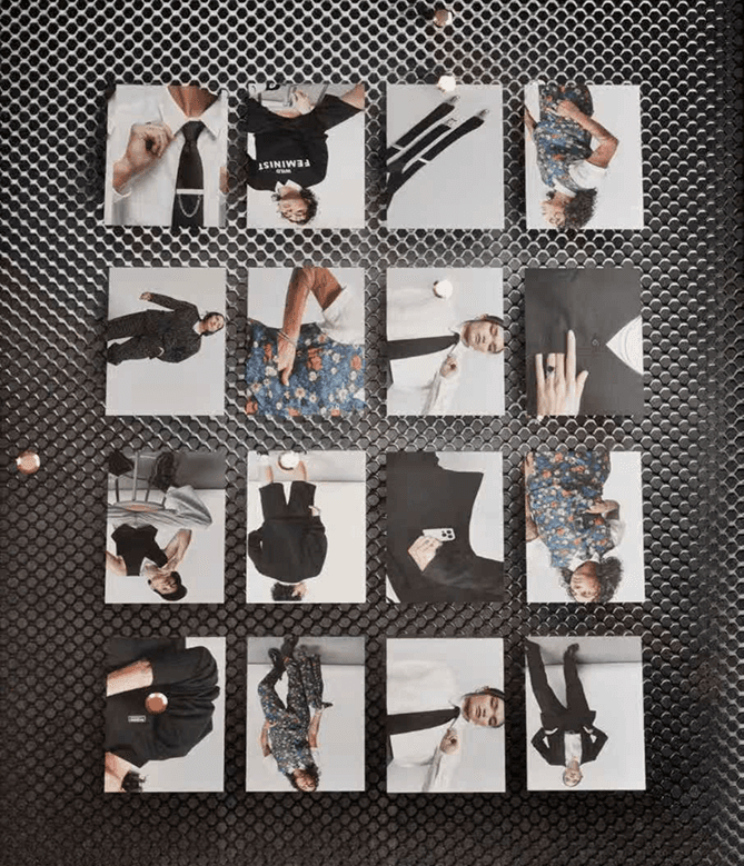 Alongside it, the photo wall operates as a visual extension of the fitting experience. Arranged as a grid of gestures and poses, it narrates Wildfang’s brand attitude through movement, styling, and embodied confidence. Rather than functioning as passive imagery, the wall becomes an active backdrop that mirrors the wearer’s stance, allowing personal identity and brand expression to intersect within the retail environment.