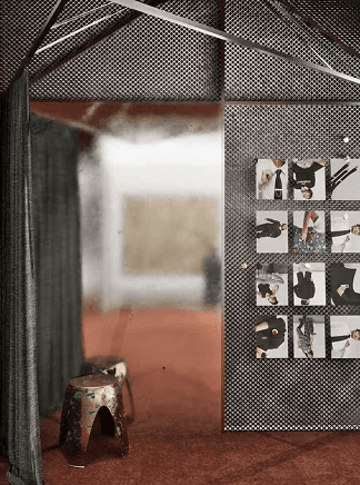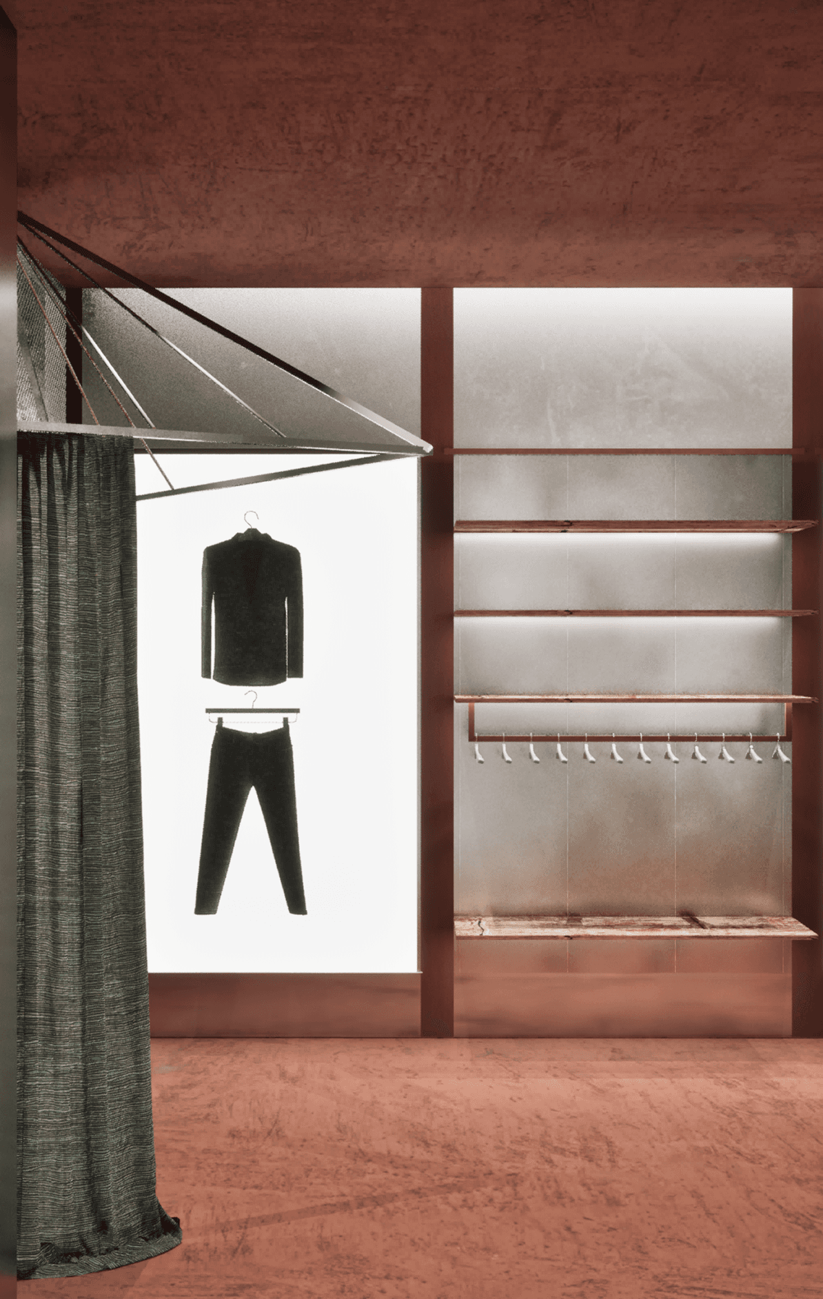 The semi-open fitting room is articulated through a geometric framework, creating a space that feels both exposed and protected. Reflective materials intensify the experience, echoing the cold clarity and authority of an office environment while allowing the body to remain visibly present within the architecture. This controlled transparency transforms the act of changing into a moment of composure and self-definition, where posture, reflection, and spatial tension reinforce a sense of strength.